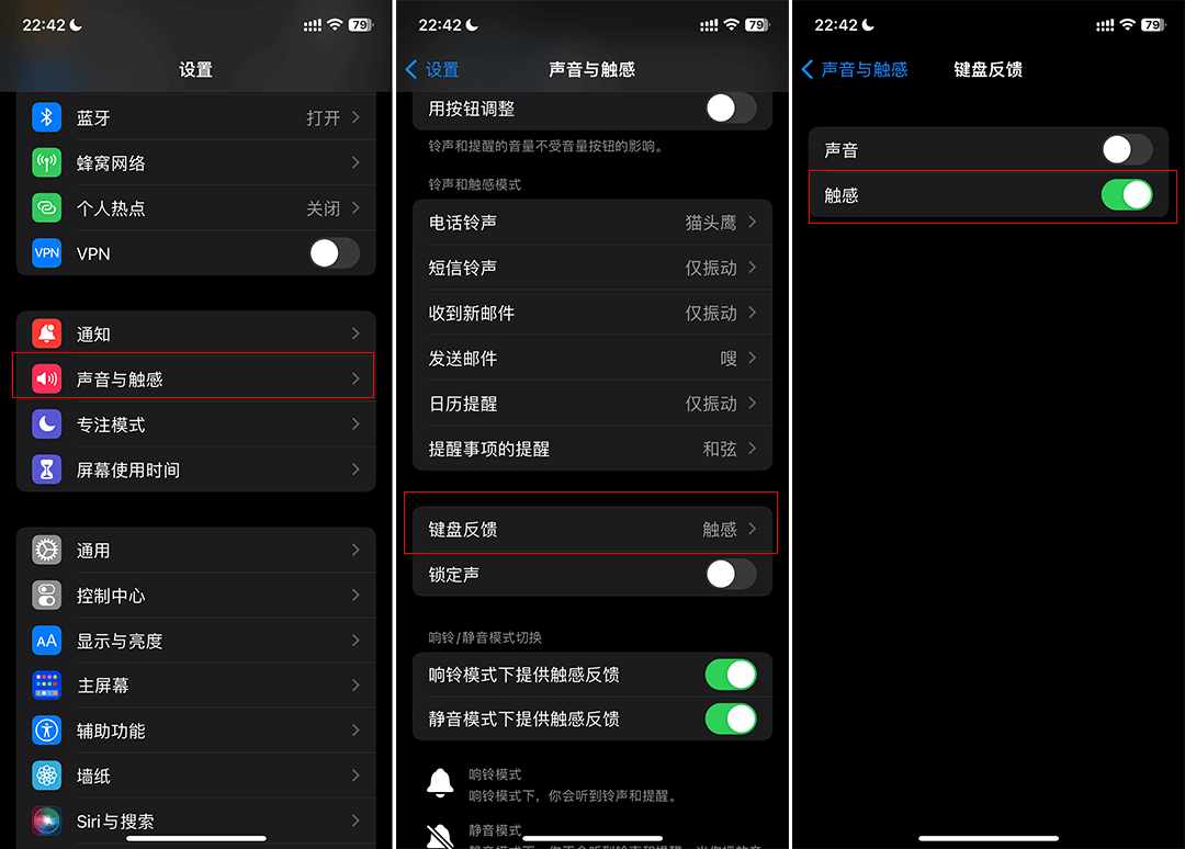 - 打开触感开关就可以开启使用 iPhone 的键盘震动反馈