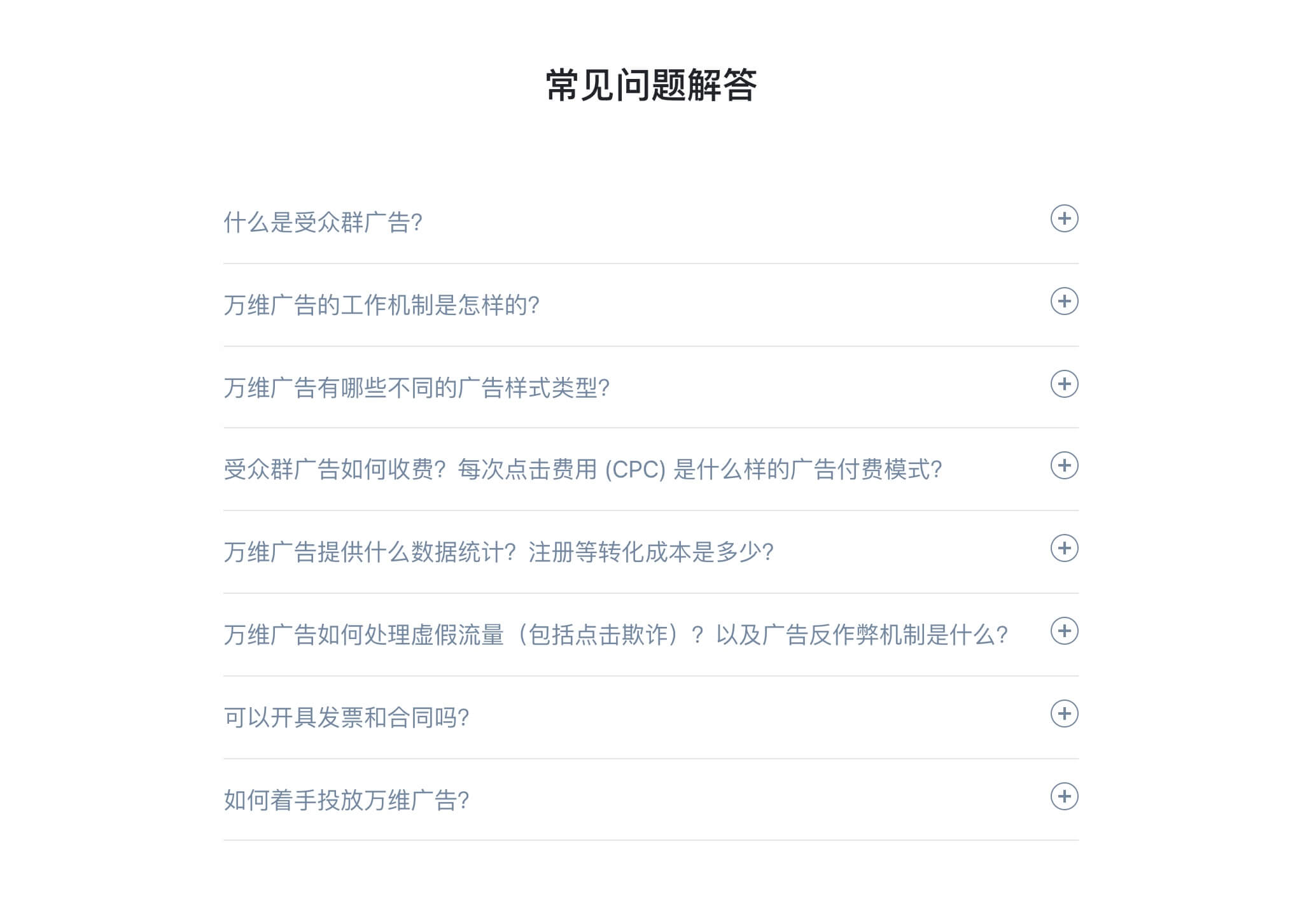如果 Hero 和功能描述依然无法完全解答访客的常见疑问,你可以专门设计一个 FAQ 来说明常见问题解答,例如: