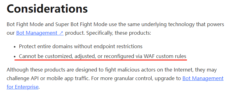 以前好像没有这个问题,现在界面改版后可能逻辑也改了,设置排除规则可能是无效的,在指南里可以看到这个Bot Fight Mode优先级比较高。