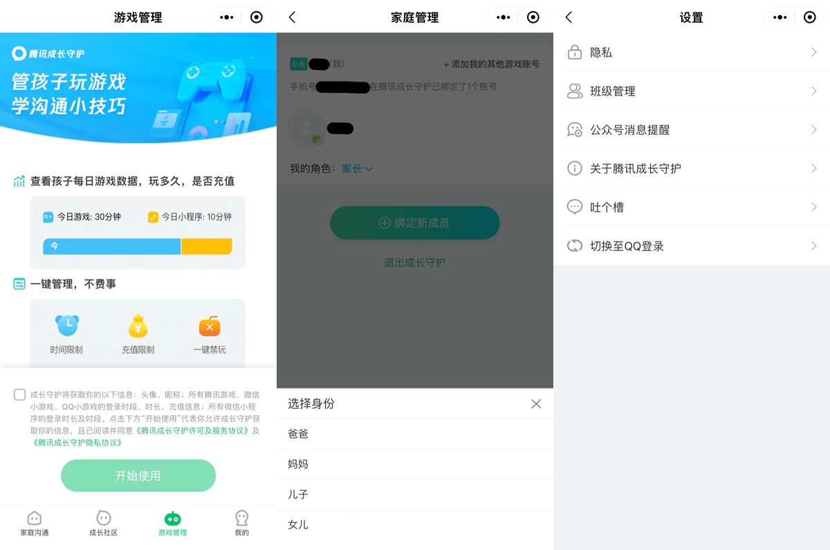 在微信小程序中搜“腾讯成长守护”就能找到,注册后可以添加成员,然后家长身份的用户可以管控小孩账号。