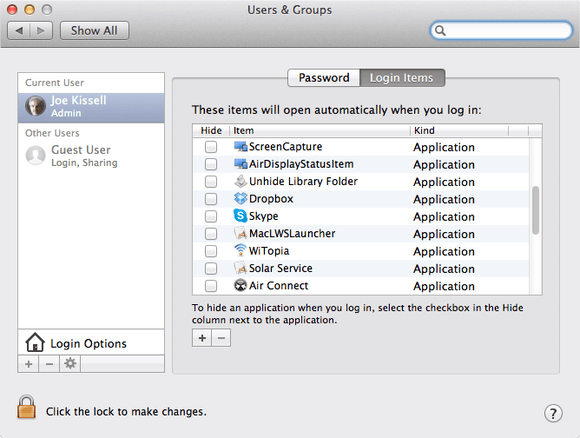 项目通常会出现在此列表中,因为您安装的应用程序将它们添加到了其中。大多数这样做的应用程序会先征求您的许可,或者在其设置中具有“登录时打开”或类似的复选框。在任何情况下,您都可以通过单击 (+) 按钮手动将项目添加到列表中,或者通过选择项目并单击减号 (-) 按钮来删除项目。您可能还需要登录您的 Mac 用户配置文件才能进行更改