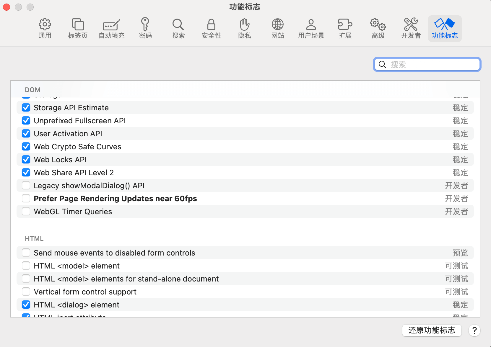 然后右侧会出现两个新的设置项,在“功能标志”中找到“Prefer Page Rendering Updates near 60fps”,取消勾选,然后Mac版的Safari浏览器就支持网页120fps刷新率了。