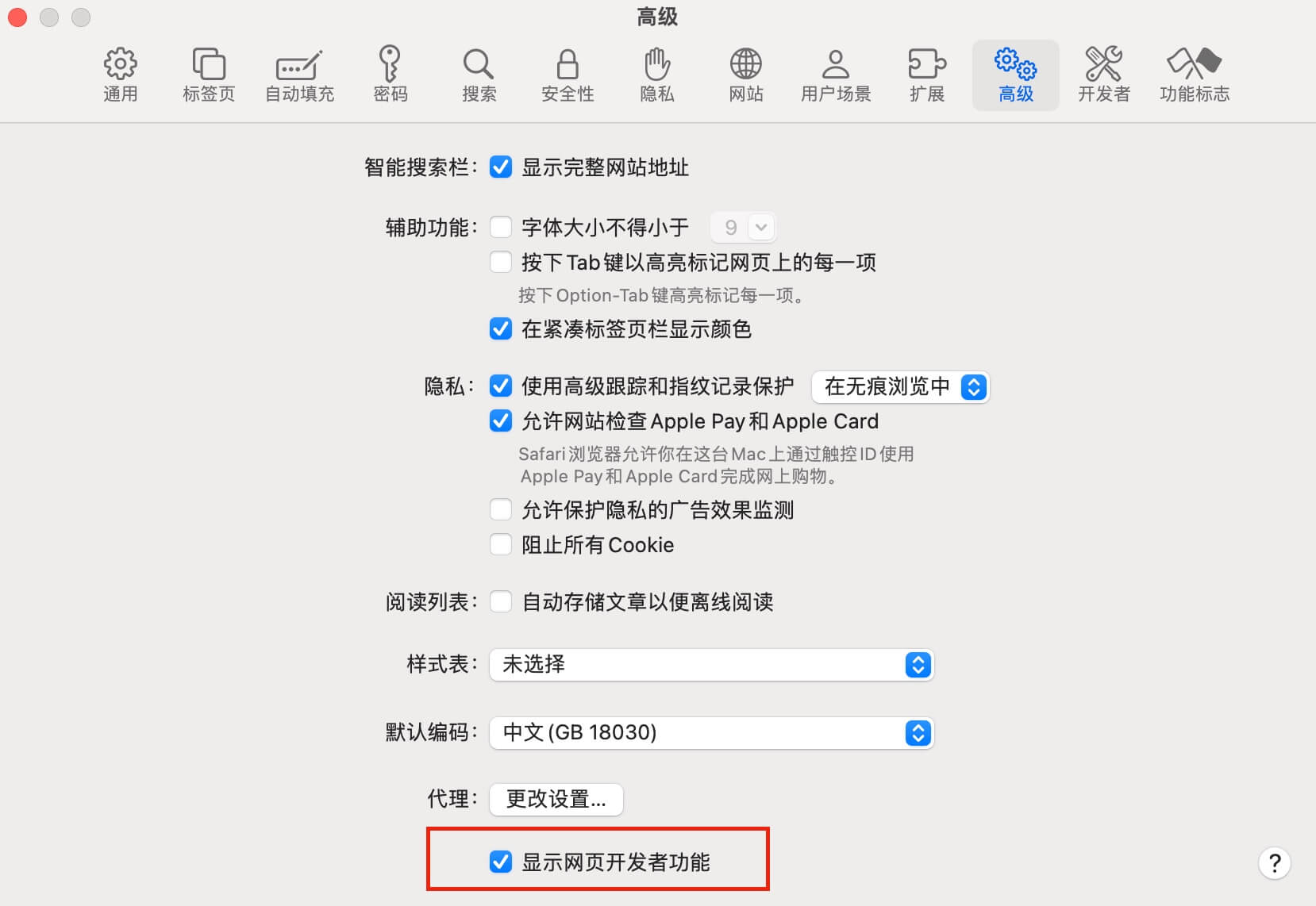 打开Safari浏览器设置,切换至“高级”,勾选底部的“显示网页开发者功能”;