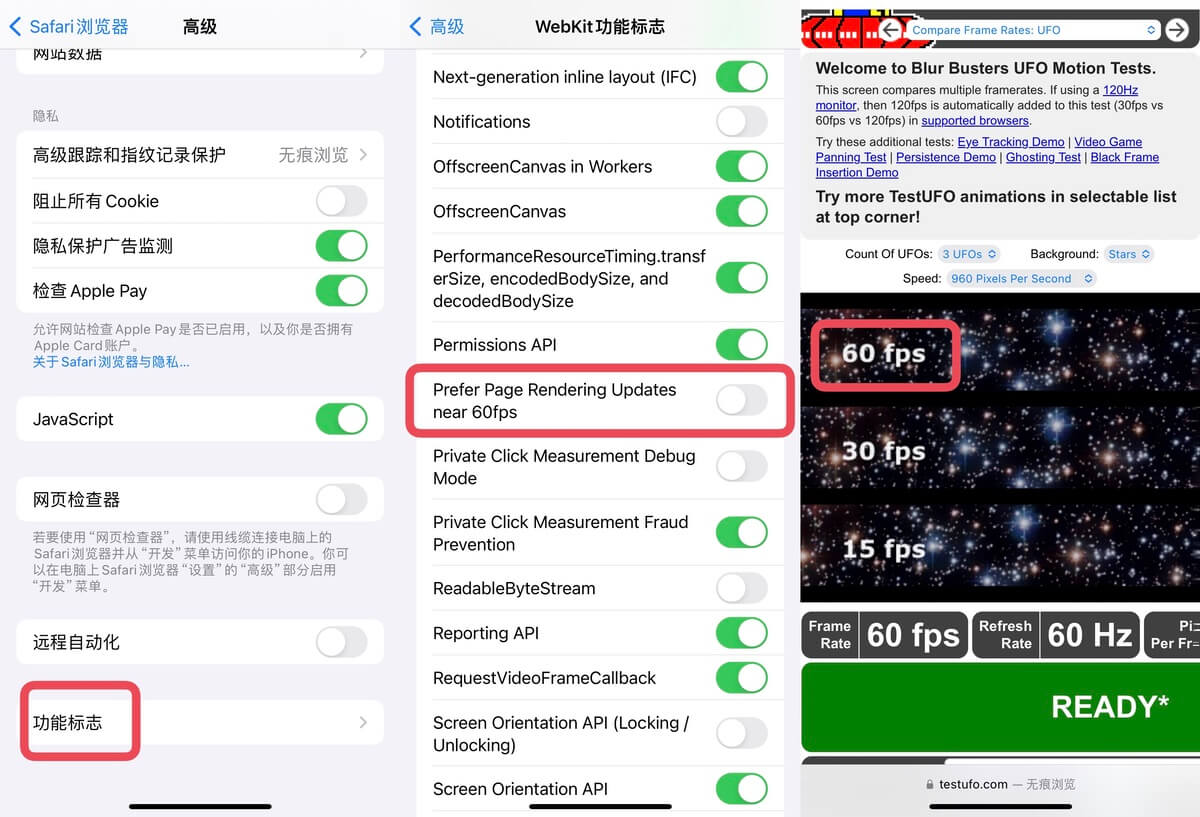 另外,iPhone版的Safari浏览器也有这个设置项,但是即便关闭限制,也没法实现120fps刷新率,只有60fps。